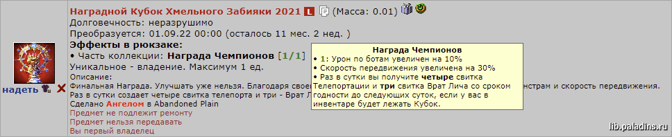 Если у игрока есть прошлогодний Наградной Кубок Хмельного Коллекционера L , то его необходимо иметь при себе.