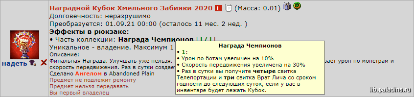 Если у игрока есть прошлогодний Наградной Кубок Хмельного Коллекционера L , то его необходимо иметь при себе.