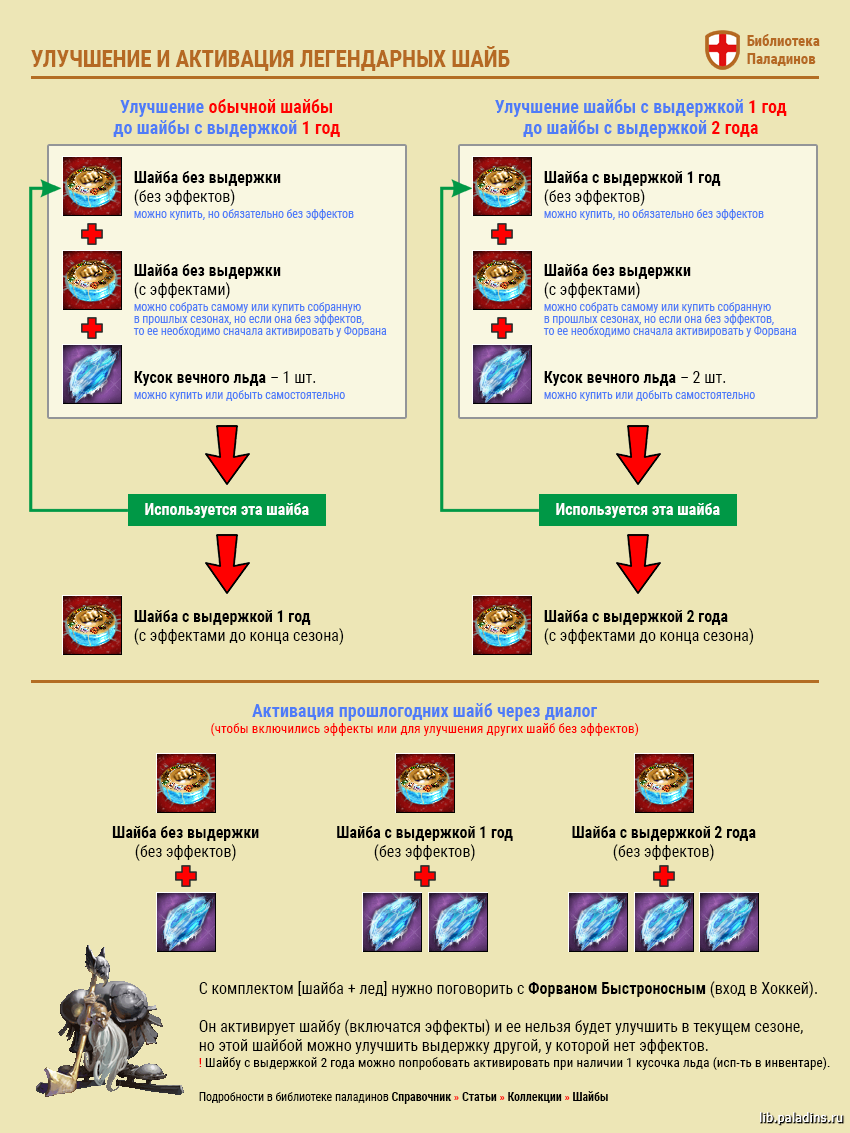 С приходом зимы появляется возможность собирать шайбы, которые являются частями коллекции. Коллекцию шайб (14 штук) игрок может объединить и получить легендарную шайбу (для объединения коллекции нужно использовать Сувенирную Шайбу East city). Все шайбы, кроме L обладают слабыми эффектами. Легендарные шайбы имеют абсолютные модификаторы и дополнительно дают модификаторы мощности урона и стихий. 2. Шайбы L отличаются названиями (золоченая, светлая, темная) и бывают обычными или с выдержкой: • Шайба текущего года • Шайба прошлого года (выдержка 1 год) • Шайба позапрошлого года (выдержка 2 года) Шайбы с разными названиями, но одного года имеют одинаковые эффекты (то есть шайбы текущего года, независимо от названия, работают одинаково) Максимальная выдержка шайбы – 2 года. Шайбы можно купить на аукционе или напрямую у игроков. 3. Легендарные шайбы все время, кроме зимы, являются сувенирными и в названиях присутствует слово "сувенирная". В начале зимнего сезона шайбы теряют приставку "сувенирная", но и сами по себе давать эффекты не начинают. 4. Шайбы, собранные в прошлых годах, можно просто активировать, чтобы они начали давать эффекты, или улучшить их выдержку, которая влияет на силу эффектов. Просто активированные шайбы в текущем году улучшить уже нельзя (просто активировать имеет смысл только шайбу 2 года выдержки). Если шайба не максимальной выдержки (2 года), ее рекомендуется улучшить, чтобы получать более сильные эффекты. Для этого нужно дополнительно иметь еще одну легендарную шайбу и особые ингредиенты. Итого: легендарную шайбу в текущем году можно или активировать (без улучшения выдержки) или улучшить выдержку. С одной легендарной шайбой можно совершить только одно действие в году. 5. Чтобы улучшить выдержку шайбы: Нужна одна легендарная шайба без работающих эффектов (собранная в прошлых сезонах или купленная) + еще одна легендарная шайба с работающими эффектами (собранная в текущем сезоне или купленная и самостоятельно активированная) + кусочки вечного льда. Существует только два варианта улучшения шайб (их выдержки) и других не существует: • обычная шайба – до шайбы с выдержкой 1 год • шайба с выдержкой 1 год – до шайбы с выдержкой 2 года Для получения Шайбы Вечного Льда (выдержка 1 год) понадобится: Используется шайба без эффектов – игрок получит Для получения Шайбы Вечного Льда (выдержка 2 года) понадобится: Используется шайба с выдержкой 1 год без эффектов – игрок получит То есть можно, например, купить две шайбы без эффектов и без выдержки, одну из них активировать у Форвана, вторую использовать и получится активная шайба с выдержкой 1 год. 6. Чтобы просто активировать шайбу: (без улучшения, например шайбу с выдержкой 2 года или обычную для улучшения другой шайбы): Если игроку нужно именно активировать шайбу, чтобы включились эффекты, которые будут работать до конца сезона, – необходимо поговорить с Форваном Быстроносным в Dreams cityДля активации нужно иметь саму шайбу и кусочки льда в количестве, в зависимости от выдержки. • для активации шайбы без выдержки – нужен • для активации шайбы с выдержкой 1 год – нужно • для активации шайбы с выдержкой 2 года – нужно Внимание! Активированные таким образом шайбы нельзя улучшить, но их можно использовать для улучшения других шайб! 7. Инфографика, где наглядно показан процесс улучшения или акти