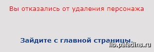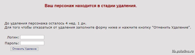 А на странице персонажа появится соответствующая отметка.   Если вы хотите зарегистрировать нового персонажа, то вы должны поставить текущего персонажа на удаление, как было показано выше. При попытке зайти в игру – вы получите сообщение о том, что персонаж находится в стадии удаления. Введите логин и пароль от персонажа, чтобы отменить процедуру удаления и восстановить персонажа.   Если пароль и логин введены правильно – вам будет предложено зайти в игру с главной страницы.   После отмены удаления – повторное удаление, а также изменение пароля, e-mail, подтверждения через почту запрещены 3 суток! Автор:    Info Combats Информация в материалах от Info Combats приводится для общего ознакомления и может отличаться от той, которую получают игроки своими силами. Автор не несет ответственности за любые ошибки как в текстах, так и в процессе каких-либо действий игрока, которые привели к нежелаемым или неожиданным результатам. Опубликовано: 01.02.2018 |